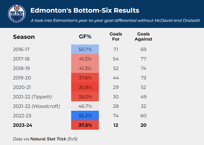 Additionally, while I heavily disliked Woodcroft’s deployment with his bottom-six, the simple fact is that Edmonton’s bottom-six was quite strong under Woodcroft for the most part.