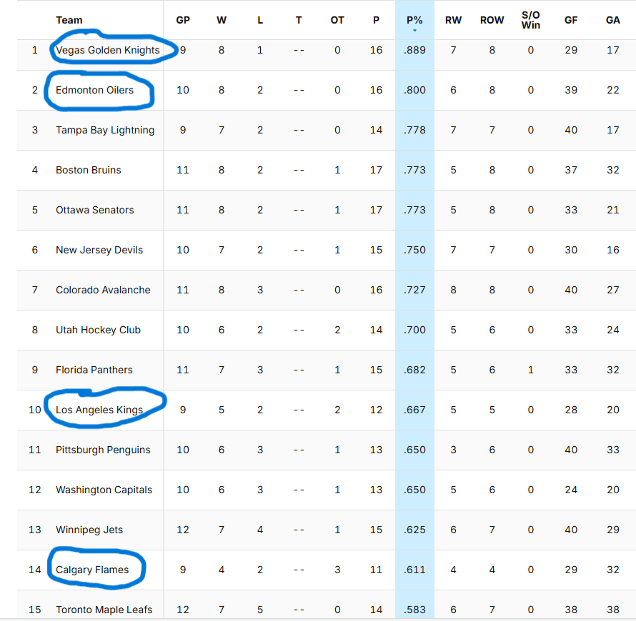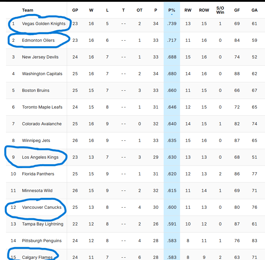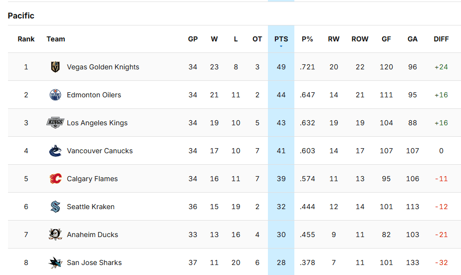 The Pacific Division is the only division in the NHL with four teams that have 41+ points and/or a points percentage above .600. Vegas, Edmonton, LA, and Vancouver are the four, while Calgary is still surprisingly in the mix with 39 points and a .574P%.