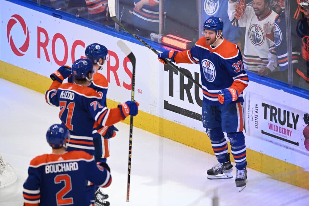 May 14, 2023; Edmonton, Alberta, CAN; Edmonton Oilers left winger Warren Foegele (37) celebrates a goal on Vegas Golden Knights during the first period in game six of the second round of the 2023 Stanley Cup Playoffs at Rogers Place. Mandatory Credit: Walter Tychnowicz-USA TODAY Sports