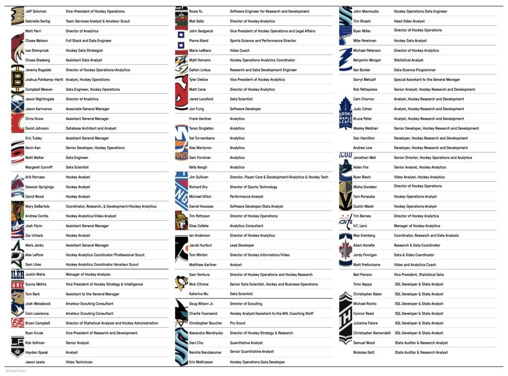 All in all, teams across the league are building out large analytics departments. The Oilers, meanwhile, are still far behind in its use. Here’s a full list of publicly known analytics hires, as created by @hayyyshayyy.