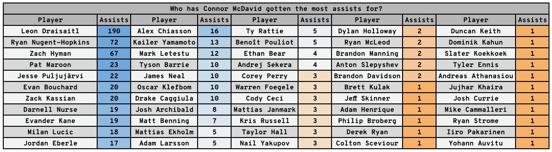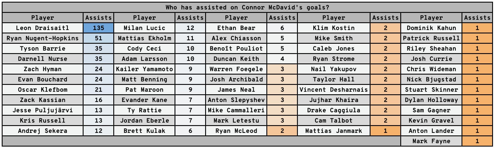 Other current Oilers in Zach Hyman, Evan Bouchard, and Mattias Ekholm help round out the top 15. In total, 56 players have helped set up McDavid throughout his career.