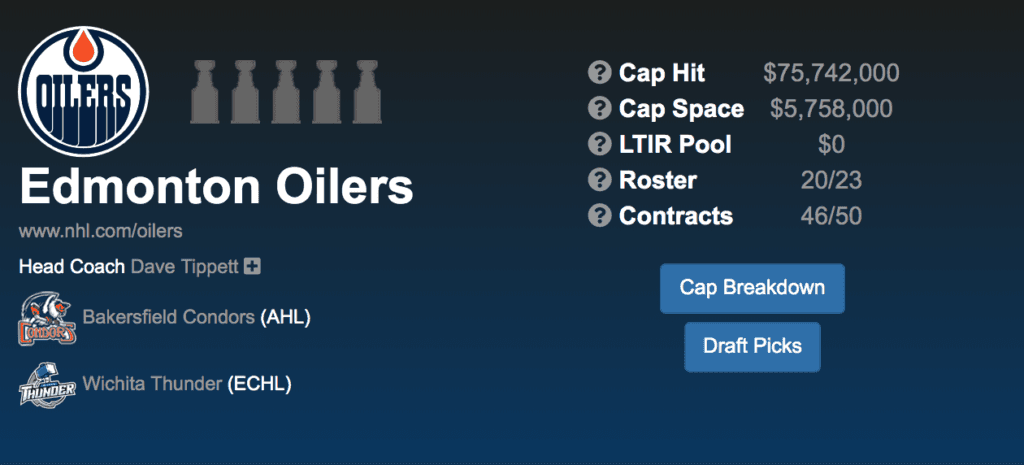 Ken Holland currently has $5.75 million in open cap space according to PuckPedia (if we assume that the Oilers will bury Brandon Manning in the AHL before the start of next season) and has 12 forwards, six defenseman, and two goaltenders under contract for next season. Assuming that the 7th defensemen will be someone like Caleb Jones, Evan Bouchard, Ethan Bear, or someone on an entry-level deal, Holland has about $4.75 million left to spend this summer.