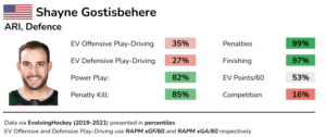 The Coyotes generate scoring chances at a lower rate with Gostisbehere on-ice, and allow chances against at a higher rate. His even-strength production isn’t anything spectacular either. In addition, Gostisbehere plays sheltered minutes. He’s only played elite competition at a superior rate than 16% of the league.