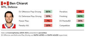 Chiarot does play tough minutes, but per PuckIQ, out of the seven defencemen in Montreal that have played a minimum of 200 TOI against elite competition in the past two seasons, Chiarot ranks dead last in both goal and scoring chance share. I’d say he’s more suited for an offensively-inclined third pairing role, as opposed to a top-four role on a contender.