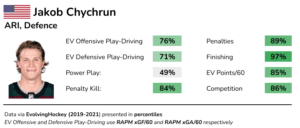 I feel that Chychrun’s plus/minus is very misleading. The +/- stat in general is exceedingly flawed, as it doesn’t account for teammates or goaltending. The Coyotes have an 86.7 SV% with Chychrun on-ice; that’s not entirely his fault.