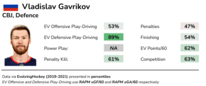 Gavrikov is a fairly average offensive defenceman, but he is excellent defensively at suppressing both goals and chances against. Per Corey Szjadner, his zone denial rates rank in the 70-80th percentiles among defencemen. In addition, his rate of playing time against difficuly competition is roughly at the level of the average 2nd pair defenceman.