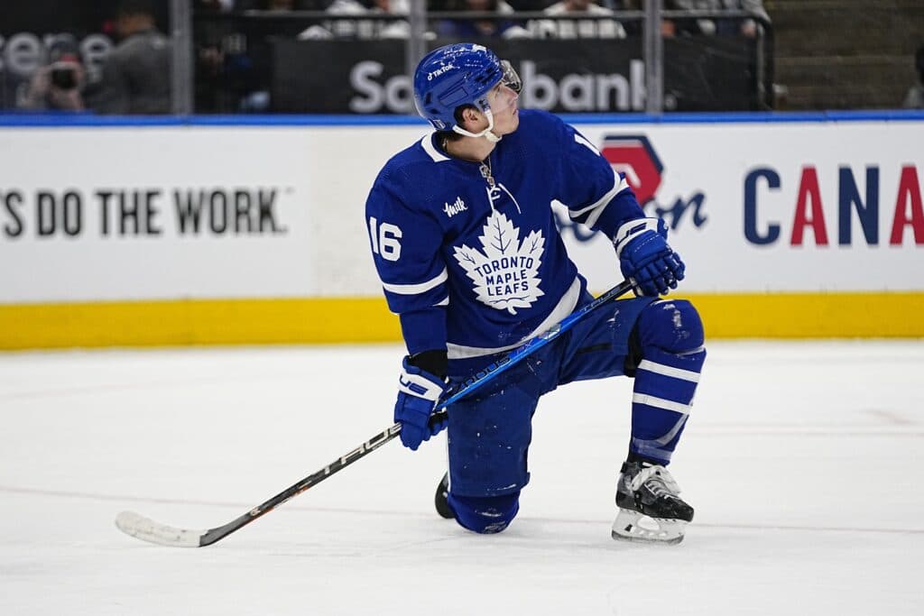 Apr 18, 2023; Toronto, Ontario, CAN; Toronto Maple Leafs forward Mitchell Marner (16) looks up at the scoreboard during the first period of game one of the first round of the 2023 Stanley Cup Playoffs against the Tampa Bay Lightning at Scotiabank Arena. Mandatory Credit: John E. Sokolowski-USA TODAY Sports