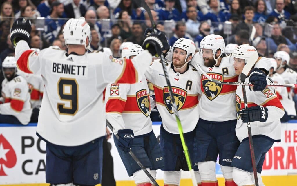 May 2, 2023; Toronto, Ontario, CANADA; Florida Panthers forward Sam Bennett (9) skates toward teammates to celebrate his goal against the Toronto Maple Leafs in the second period in game one of the second round of the 2023 Stanley Cup Playoffs at Scotiabank Arena. Mandatory Credit: Dan Hamilton-USA TODAY Sports