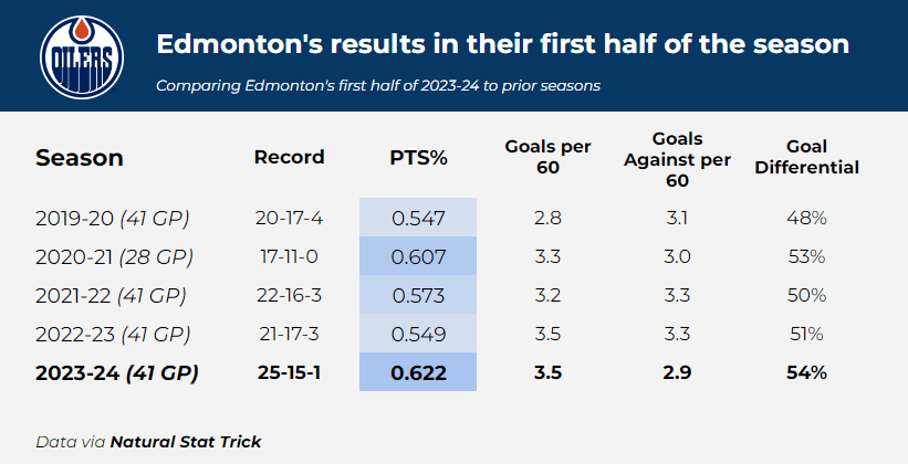 We are officially at the halfway point of the 2023-24 season, as Edmonton has now played 41 games. How does their first half compare to their first halves from prior seasons?