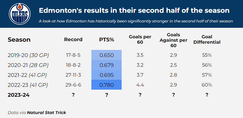 It will be quite interesting to observe how the remainder of Edmonton’s 2023-24 will progress. The average points percentage of Edmonton’s second halves of their prior four seasons is 0.701; if, hypothetically, they had a 0.701 P% for their final 41 games, they would finish the 2023-24 season with roughly 108-109 points, which should guarantee them a top-eight spot in the league and a top-two spot in the division.