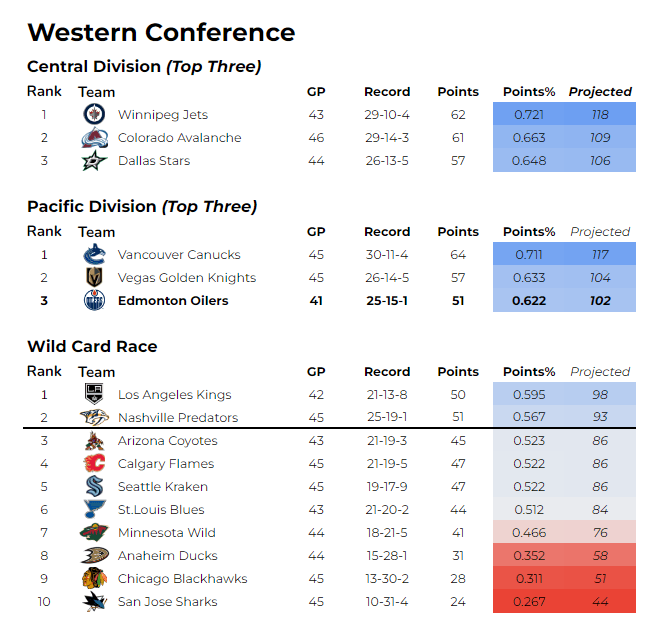 At the moment, the Winnipeg Jets and the Vancouver Canucks rank atop the Western Conference, and rank first/third respectively in the entire league in terms of points percentage.