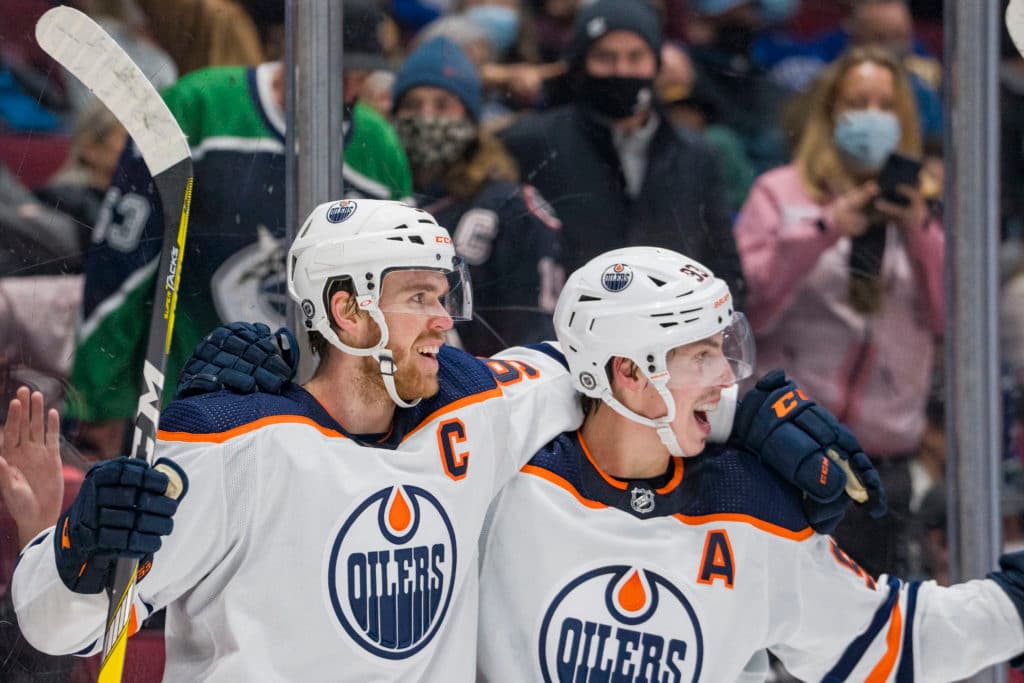 Jan 25, 2022; Vancouver, British Columbia, CAN; Edmonton Oilers forward Connor McDavid (97) and forward Ryan Nugent-Hopkins (93) celebrate McDavid’s game winning goal against the Vancouver Canucks at Rogers Arena. Oilers won 3-2 in Overtime.