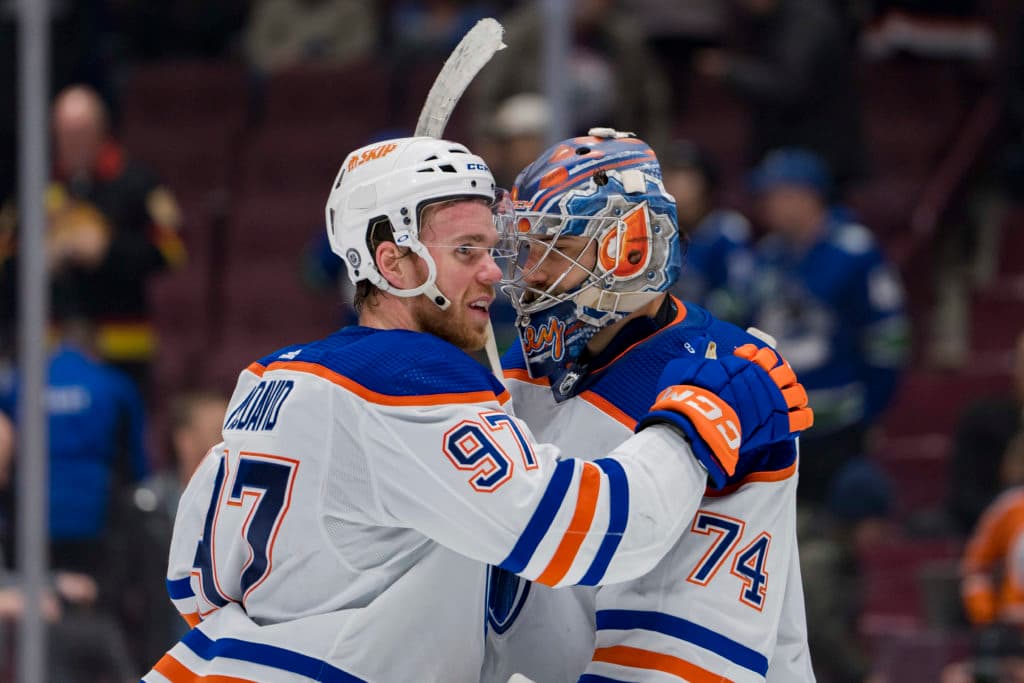 Jan 21, 2023; Vancouver, British Columbia, CAN; Edmonton Oilers forward Connor McDavid (97) and goalie Stuart Skinner (74) celebrate their victory against the Vancouver Canucks Rogers Arena. Oilers won 4-2. Mandatory Credit: Bob Frid-USA TODAY Sports