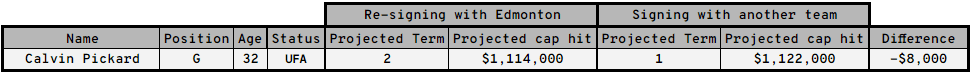 The Oilers will need to address their backup goaltending spot. Pickard will be an option, but there will be others on the market, too. Edmonton will likely need whoever it is on the cheap, likely in the $1-$2-million range, so Pickard could fit based on his projected contract.