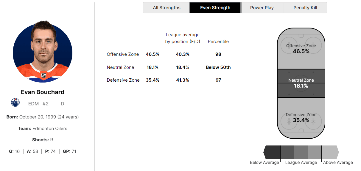 Does Bouchard’s offence outweigh his defence? Is he the massive defensive liability that many of his detractors claim? In this piece, I would like to dive into these contentious questions and analyze his even-strength play in each of the offensive, neutral, and defensive zones.