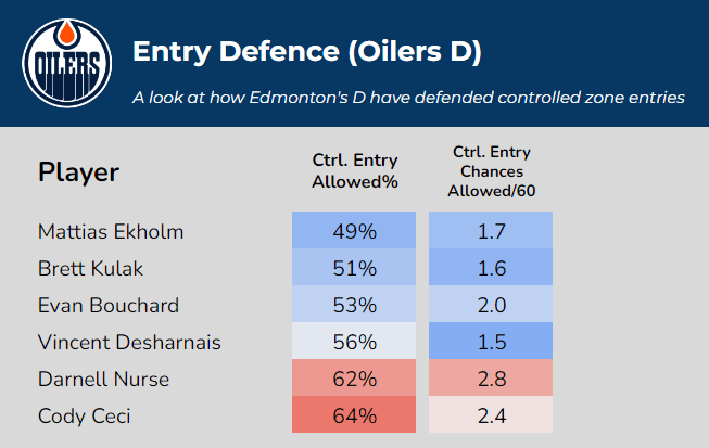 This was a game in which Ekholm was out of the lineup due to an illness, and Kulak was in his place on the top pairing. Bouchard stepped up in Ekholm’s absence, allowing just four controlled entries on 10 entry targets and led the team with four zone denials as seen above.