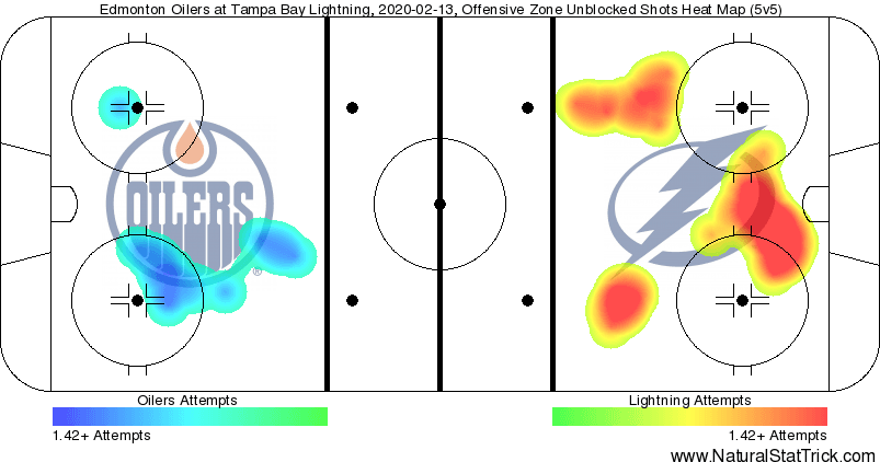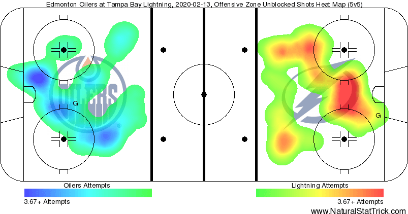 The story was @Mike Smith, making 14 saves, making 4 High Danger saves (the same amount he made in the entire game against the @Chicago Blackhawks on 11 February). The heat map shows that the Oilers did a horrible job of keeping the Lighting shooters to the outside, and allowed a tonne of chances from the points and into the High Danger area.
