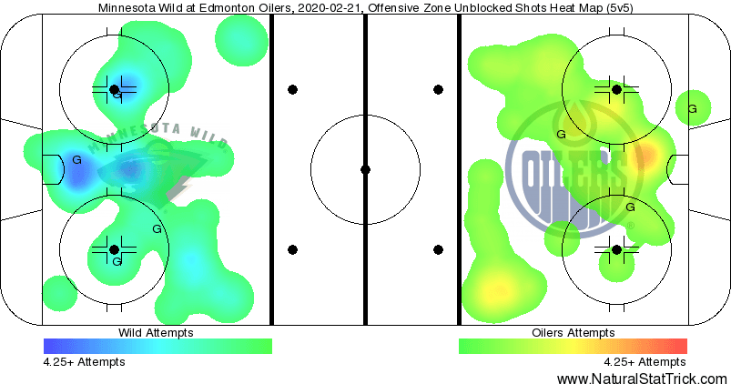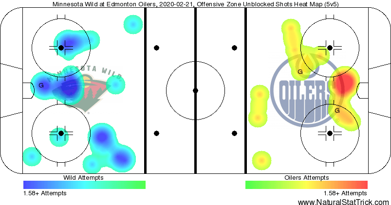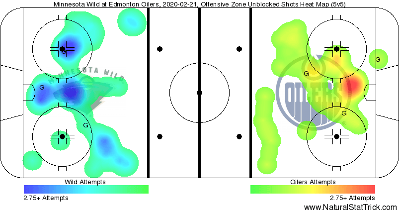 The progression of the heat map from the first period to the second show that the Oilers were able to do two important things: 1) push the Wild’s attack from a concentration in the High Danger area in the slot, and towards the Medium Danger areas towards the circles; and 2) the Oilers’ own attack did the inverse, moving in from the blueline and the left face-off dot to flood the interior.