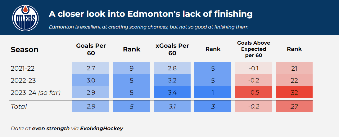 Edmonton has averaged 49 and a half minutes of even-strength play per game, which equates to 4,060 minutes over 82 games. Over an entire season, scoring 0.5 goals less than expected per hour equates to ~34 goals below expected. To put this into perspective, the difference between the 2022-23 Carolina Hurricanes (who ranked 2nd in the league) and the 2022-23 Calgary Flames (who missed the playoffs entirely) in even-strength goal differential was 32 goals.