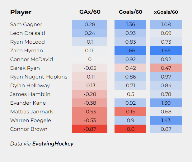 Here is a look at how Edmonton’s current forwards have performed in terms of finishing their chances, measured by GAx/60 (goals scored above expected per 60 minutes of play):
