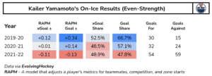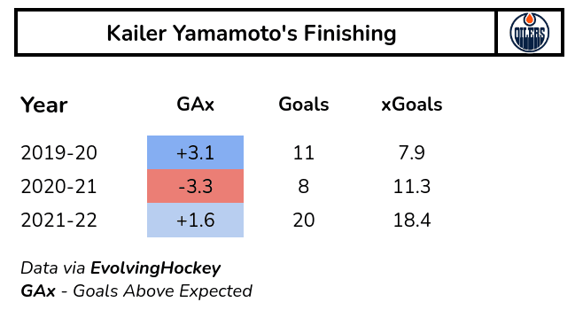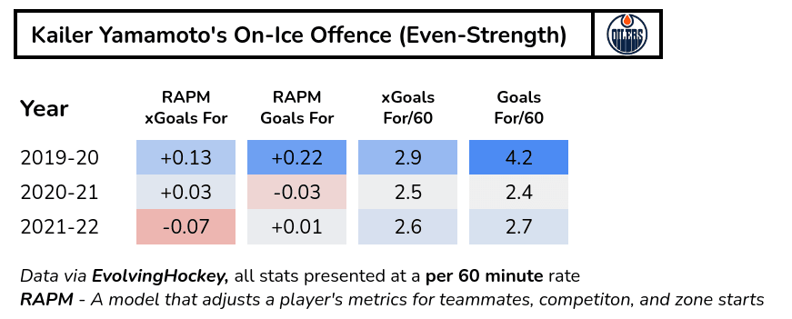 Yamamoto received exceedingly favorable goaltending luck in 2019-20 and 2020-21; the Oilers had a SV% of 0.936 and 0.934 with Yamamoto on-ice in those two years respectively, and this inflated his goal differential. Meanwhile, he obtained some poor goaltending this season.