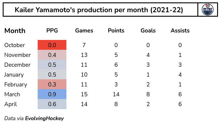 However, there was a drastic shift in his production in later months. In March, Yamamoto recorded eight goals and fourteen points in fifteen games. He continued a decently strong rate of production into April, with six points in eight games. A significant reason for his uptick in production was the hiring of Jay Woodcroft, and the results of a hot offensive stretch from the line of Kane – McDavid – Yamamoto.