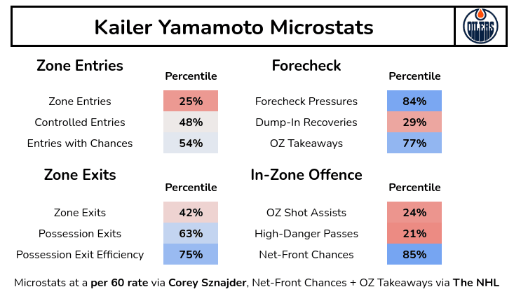This isn’t exactly a microstat, but another underrated aspect of Yamamoto’s play style is his ability to draw penalties. In the past three seasons, Yamamoto has drawn 1.01 minor penalties per hour, ranking 2nd on the team (behind McDavid, of course).