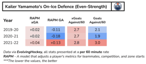 This is a good time to mention that goals against aren’t as reliable in single-season samples due to the variance in goaltending luck, and it’s important to also consider expected goals. Yamamoto’s impact on preventing scoring chances / xGA has remained fairly constant, ranking at a below-average level in each of the past three seasons.