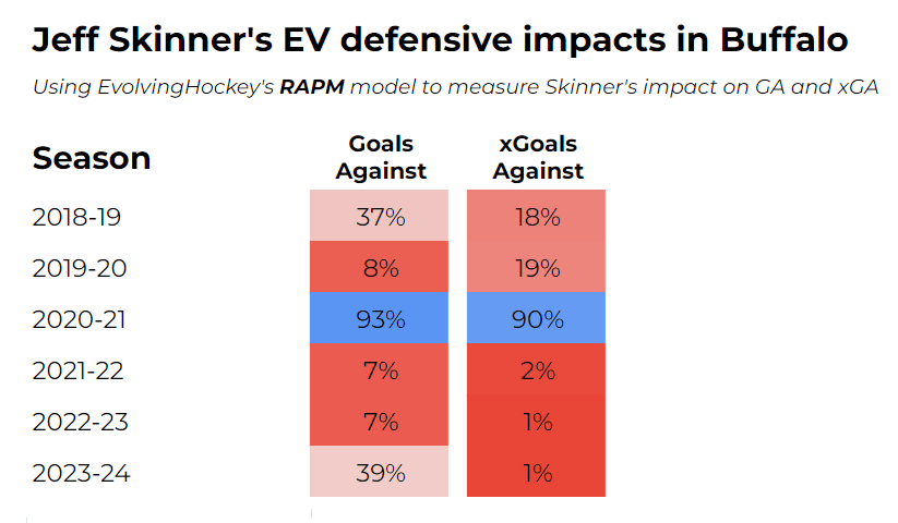 Some will immediately point out Skinner’s age, as he turns 33 next May and has seen a slight but noteworthy decline in his production from 2023-24 compared to the prior two seasons. Another downside, evident from the graphic above, is Skinner’s defensive play, which has been well below average for nearly the entirety of his career in Buffalo.
