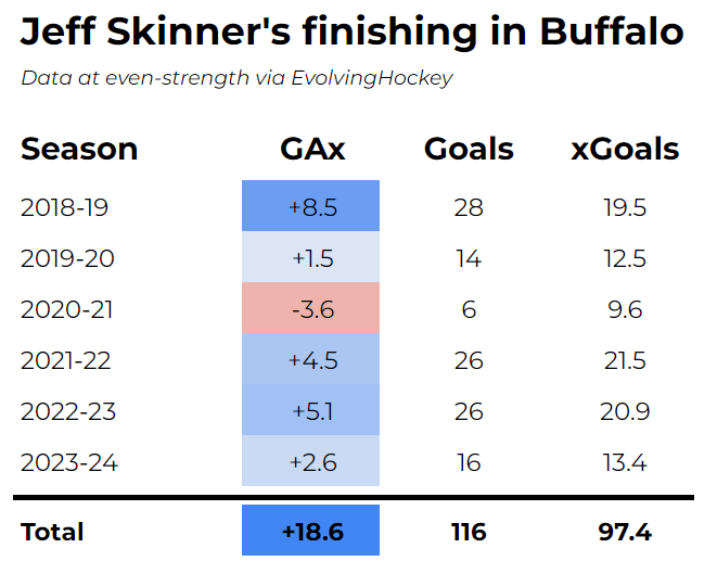 Skinner scored 40 goals in his first season in Buffalo, 28 of them at even-strength. He then had two mediocre years, scoring 14 and 7 goals in 19-20 and 20-21 respectively, but he’s back to a 32-goal pace in his past three seasons.