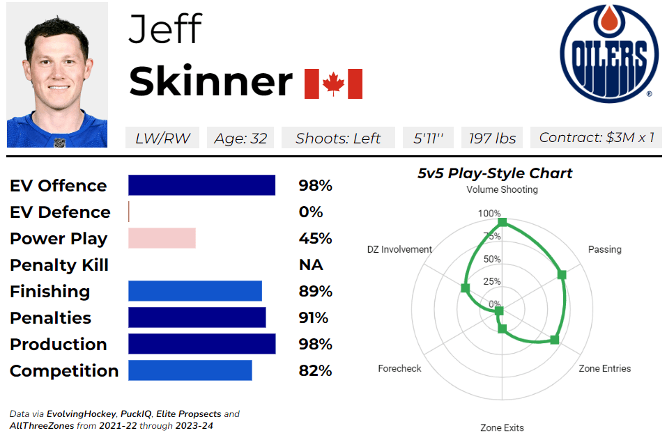 Overall, Skinner’s defensive impacts are quite poor (2020-21 seems like a bizarre outlier in his career, and it’s probably safe to dismiss it). In particular, his impact on suppressing scoring chances has been horrific in the past three seasons. He’s a subpar forechecker, not very involved in his own end, and plays an overall high-event brand of hockey. Considering that the Oilers have not made any major defensive upgrades this off-season and just dealt their best 5v5 defensive bottom-six forward in Ryan McLeod, this is a fair point to bring up.