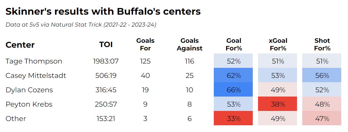 Skinner’s best two-way results came next to Casey Mittelstadt, a solid passer who was Buffalo’s best defensive center (before his trade to Colorado). Skinner was on ice for fewer goals, shots, and chances per hour playing on Mittelstadt’s wing, while his offensive rates even increased.