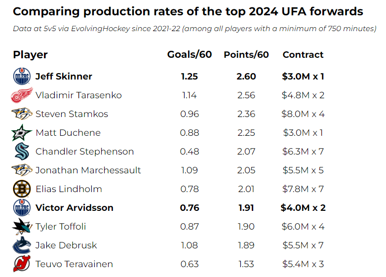 Since the beginning of the 2021-22 season, Skinner has scored at a rate of 1.25 goals per hour at 5-on-5. Among all forwards who have played a minimum of 750 minutes in that span, that ranks 10th in the entire league, and it would rank first on the Oilers.