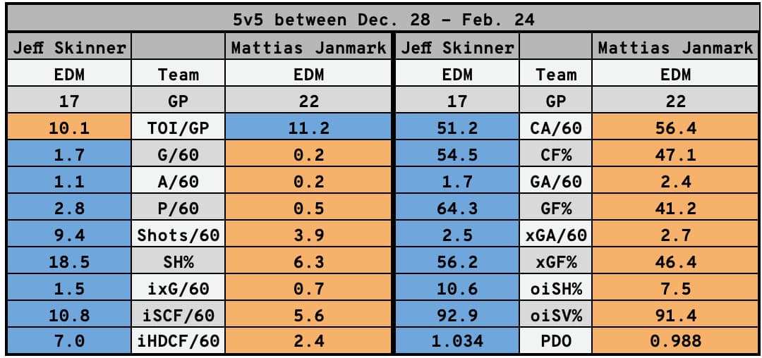 Here, for reference, are Skinner’s offensive numbers and how they rank among Oilers forwards at five-on-five since the team returned from their Christmas break on Dec. 28th: