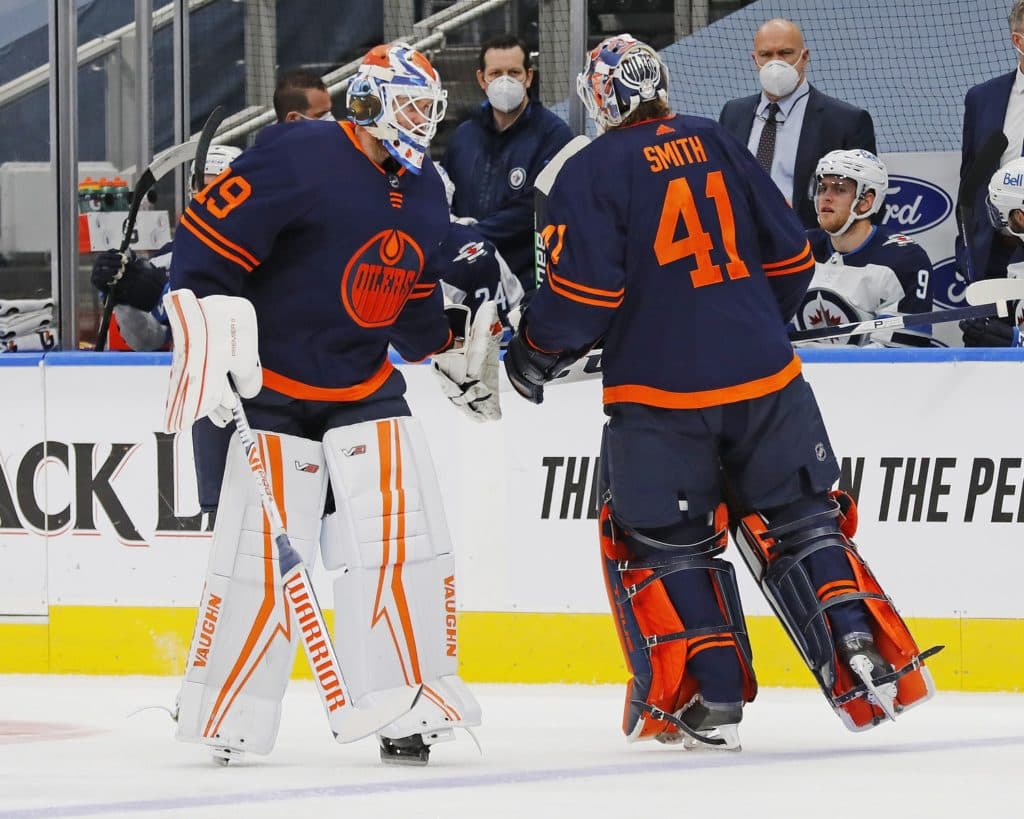 Feb 15, 2021; Edmonton, Alberta, CAN; Edmonton Oilers goaltender Mike Smith (41) is replaced by goaltender Mikko Koskinen (19) during the second period against the Winnipeg Jets at Rogers Place. Mandatory Credit: Perry Nelson-USA TODAY Sports