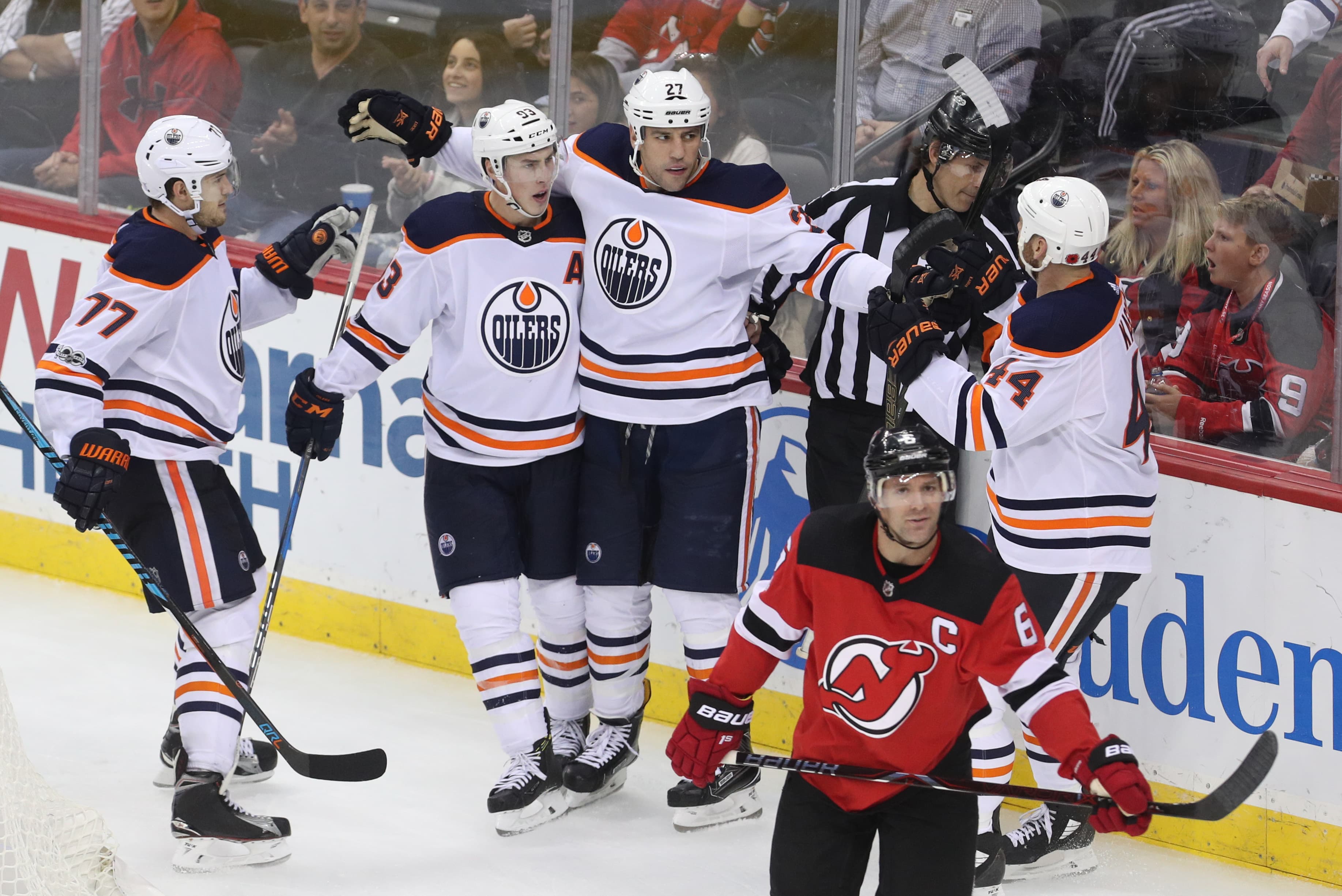 Nov 9, 2017; Newark, NJ, USA; The Edmonton Oilers celebrate a goal by left wing Milan Lucic (27) during the third period against the New Jersey Devils at Prudential Center. Mandatory Credit: Ed Mulholland-USA TODAY Sports