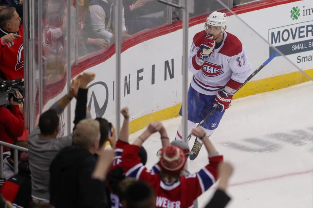 Feb 4, 2020; Newark, New Jersey, USA; Montreal Canadiens left wing Ilya Kovalchuk (17) gestures after scoring his game winning shootout goal during their game against the New Jersey Devils at Prudential Center. Mandatory Credit: Ed Mulholland-USA TODAY Sports