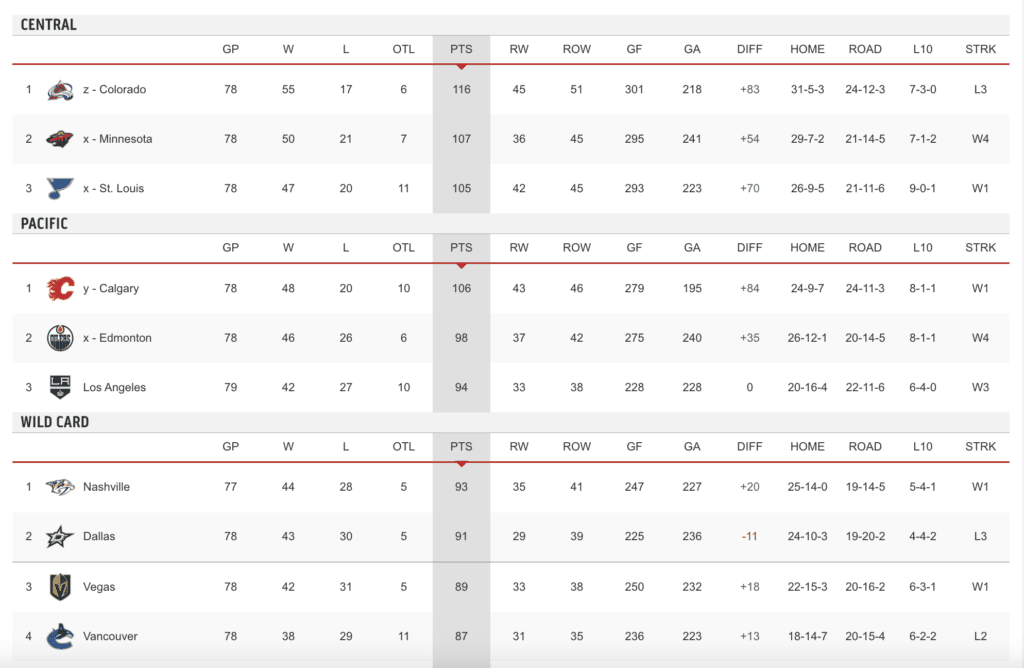 Vegas Golden Knights (89 points): At home to play SJS, on the road to play DAL, CHI, and STL.