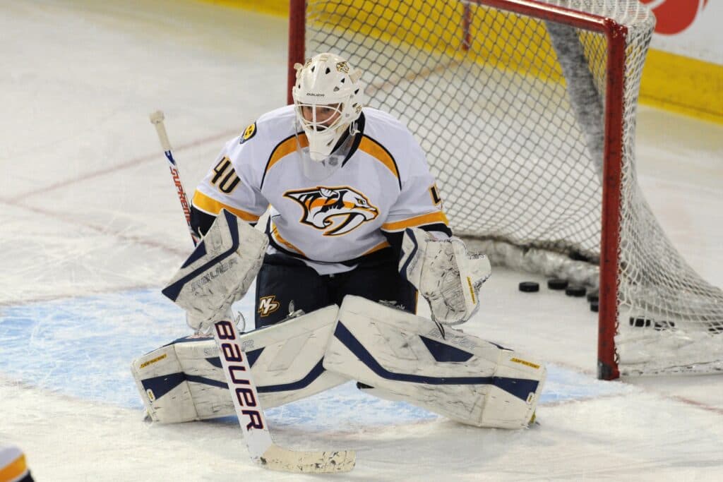 Jan 26, 2014; Edmonton, Alberta, CAN; Nashville Predators goalie Devan Dubnyk (40) warms up against the Edmonton Oilers at Rexall Place. Mandatory Credit: Candice Ward-USA TODAY Sports