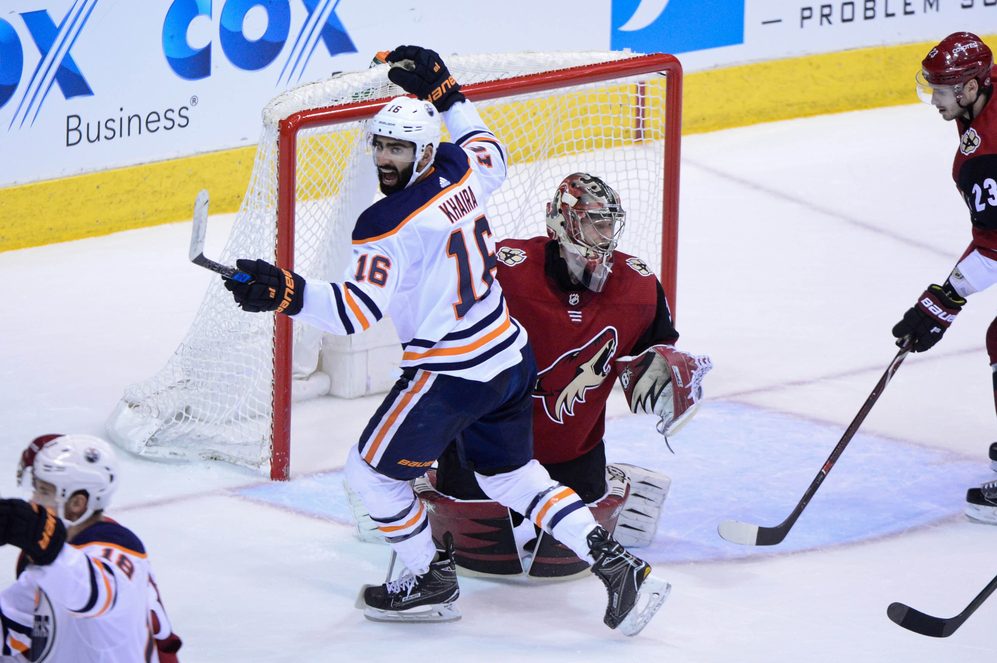 Jan 12, 2018; Glendale, AZ, USA; Edmonton Oilers left wing Jujhar Khaira (16) celebrates after a goal by defenseman Darnell Nurse (not pictured) as Arizona Coyotes goalie Antti Raanta (32) looks on during the first period at Gila River Arena. Mandatory Credit: Matt Kartozian-USA TODAY Sports