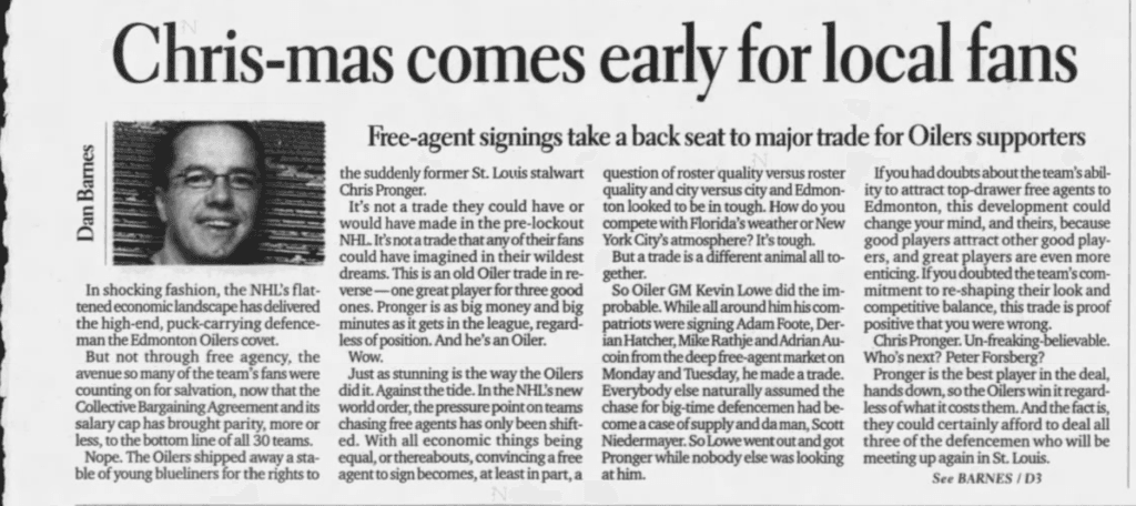 This was a player that nobody would have dreamed the Oilers could acquire before the lockout. The promises of the new NHL and its level playing field were already coming into fruition.