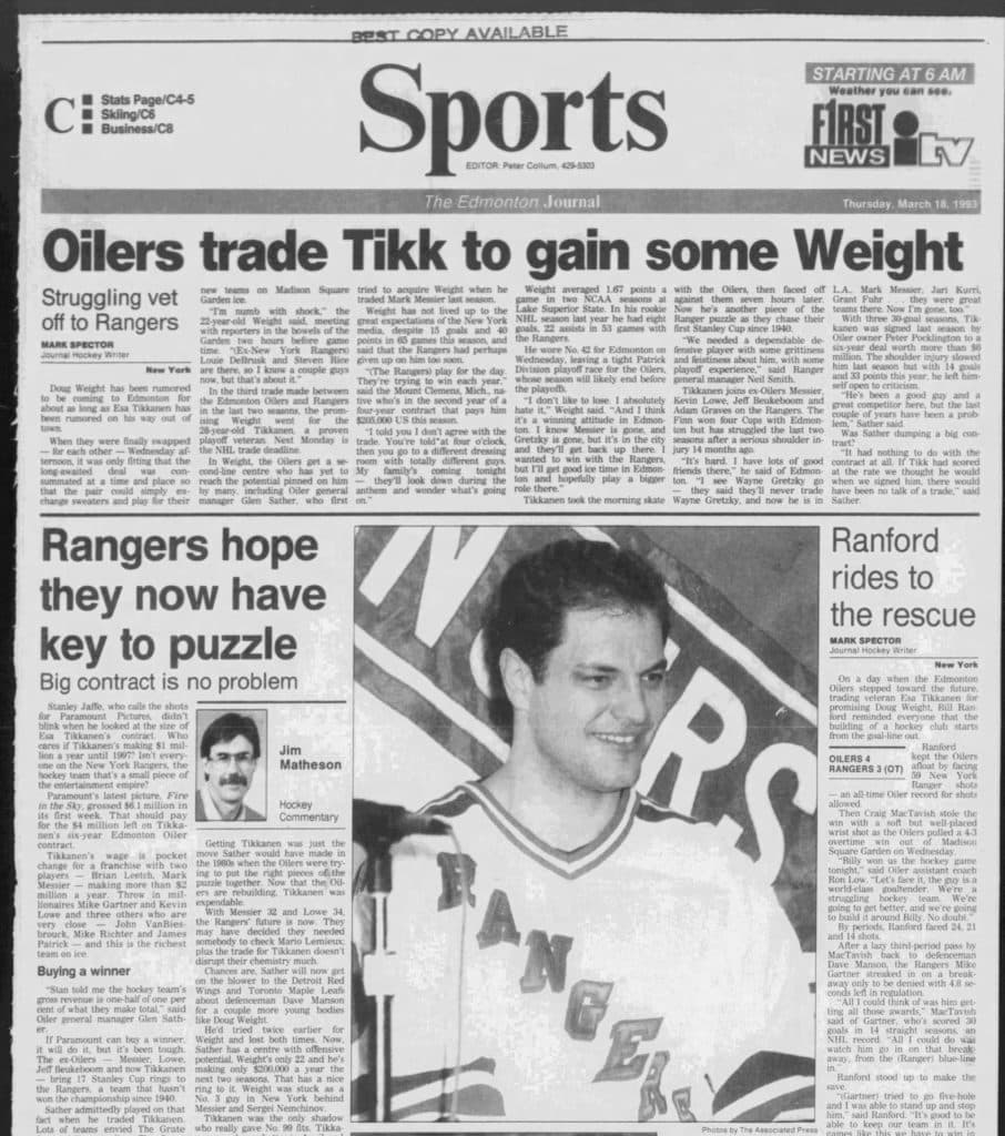 In mid-March of 1993, the struggling Oilers, who were well on their way to missing the playoffs for the first time in franchise history, sent Esa Tikkanen to the New York Rangers to join a host of other former Oilers on Broadway.