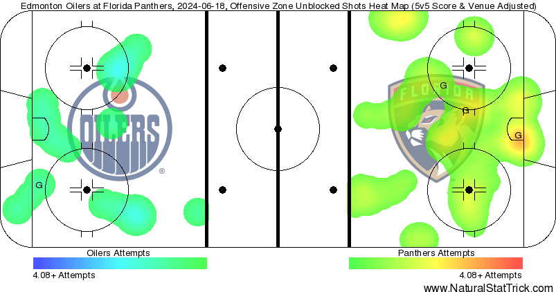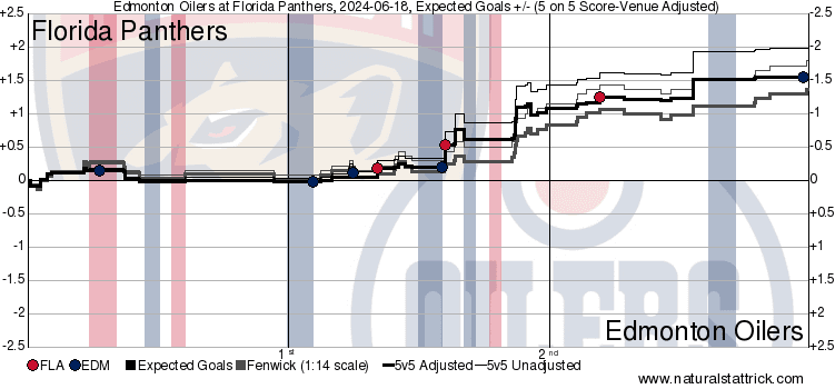 In The Crease – How about that clutch third period from Stuart Skinner. Tkachuk broke his goalless draught and started really improving the low-to-high attack the Florida Panthers were so good all season. Skinner cracked a bit, but in the end when the Oilers needed him most he was on the top of his game. No traffic, deflection, or snipe got behind him as he put everyone back on the plane home. 2.73 expected goals against with three getting behind him at 5v5. Oh yeah, the W too.