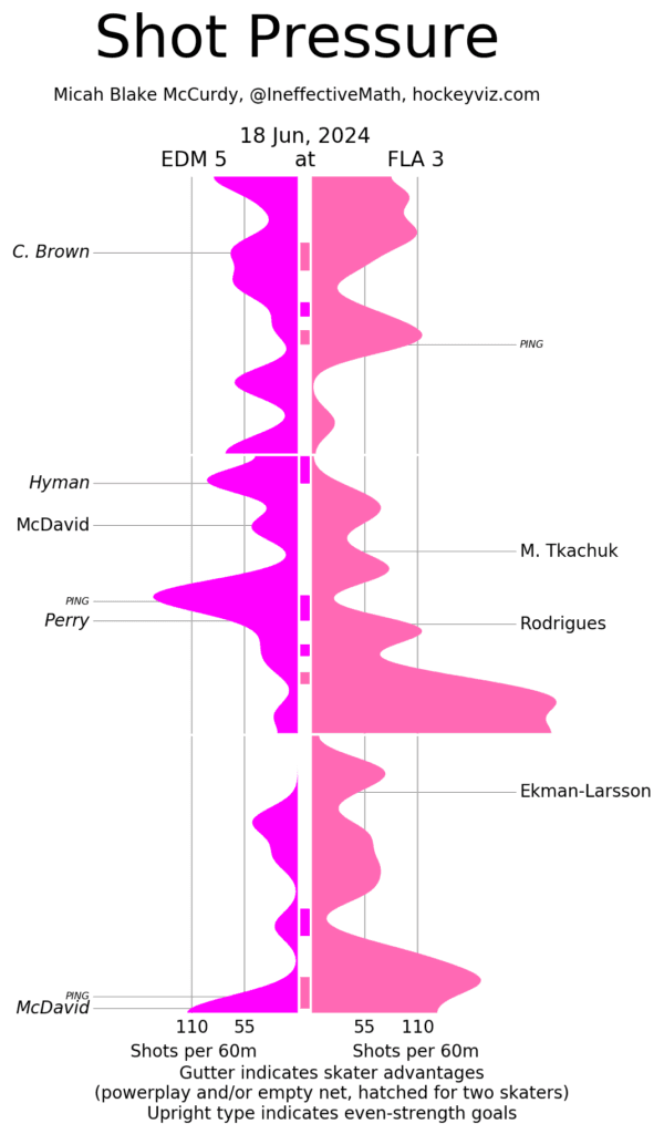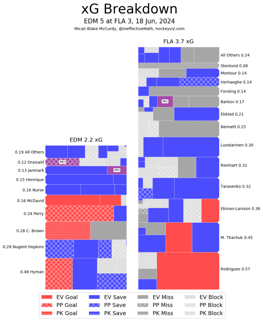Taken By Chance – I really do not expect the Oilers to change anything going forward, especially after two straight finals wins, but Nurse (14.61 SCF% // 16.26 HDCF%) and Broberg (8.07 percent // 16.26 percent) are hurting more than they are helping. Getting turned around in their own zone, failing zone exits, knocking pucks into the net, and losing board battles down low are just a few things both of them are failing to accomplish during wins. On games when the Oilers are attacking more often than defending they have been more effective, but in a defence first approach those two players have struggled. They played just as much 5v5 time as Ekholm (76.36 percent // 71.64 percent) and Bouchard (71.78 percent // 71.64 percent) to much different results. There are no easy matchups either as the Panthers two top lines are as formidable as any other team in the NHL.