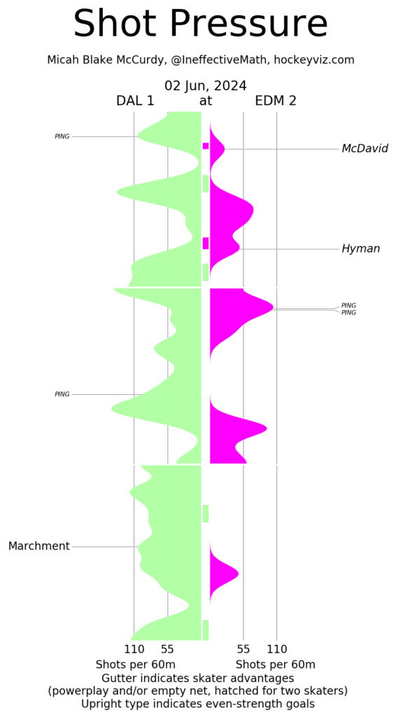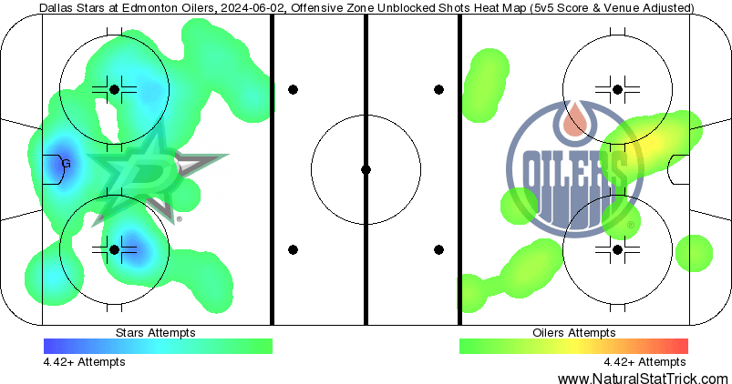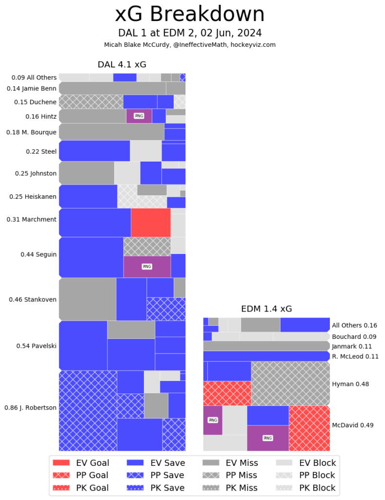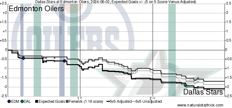 Taken By Chance – Everything in the last two games, all the offence for sure, has been driven by McDavid (32.77 SCF% // 57.50 HDCF%). With how badly the Oilers were outshot McDavid ending up with a high-danger chance advantage is a testament to his skill. The lowest number of shots on goal in a conference-clinching victory in NHL history and he comes through with a net-positive performance. Both sides of the ice were masterfully controlled by McDavid who is as close to Lord Stanley as he has ever been before. Nobody really stood out in this one as somebody who let a bunch of bad chances against, a team effort to play strong through the neutral zone all the way back into their goaltender paid off. It’s not something I would recommend anybody do – Dallas only needed a bounce to stay alive, but hey it worked when Edmonton needed it to.