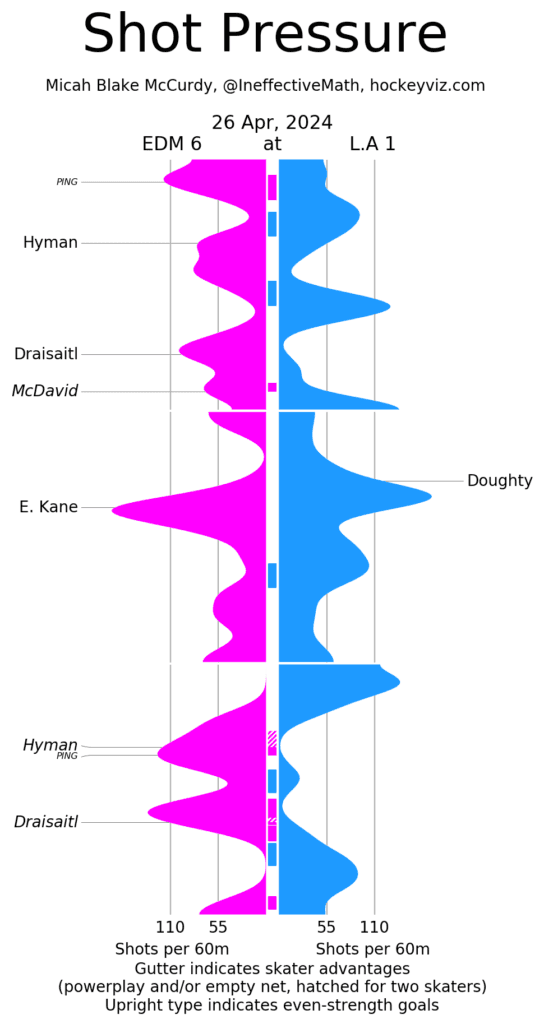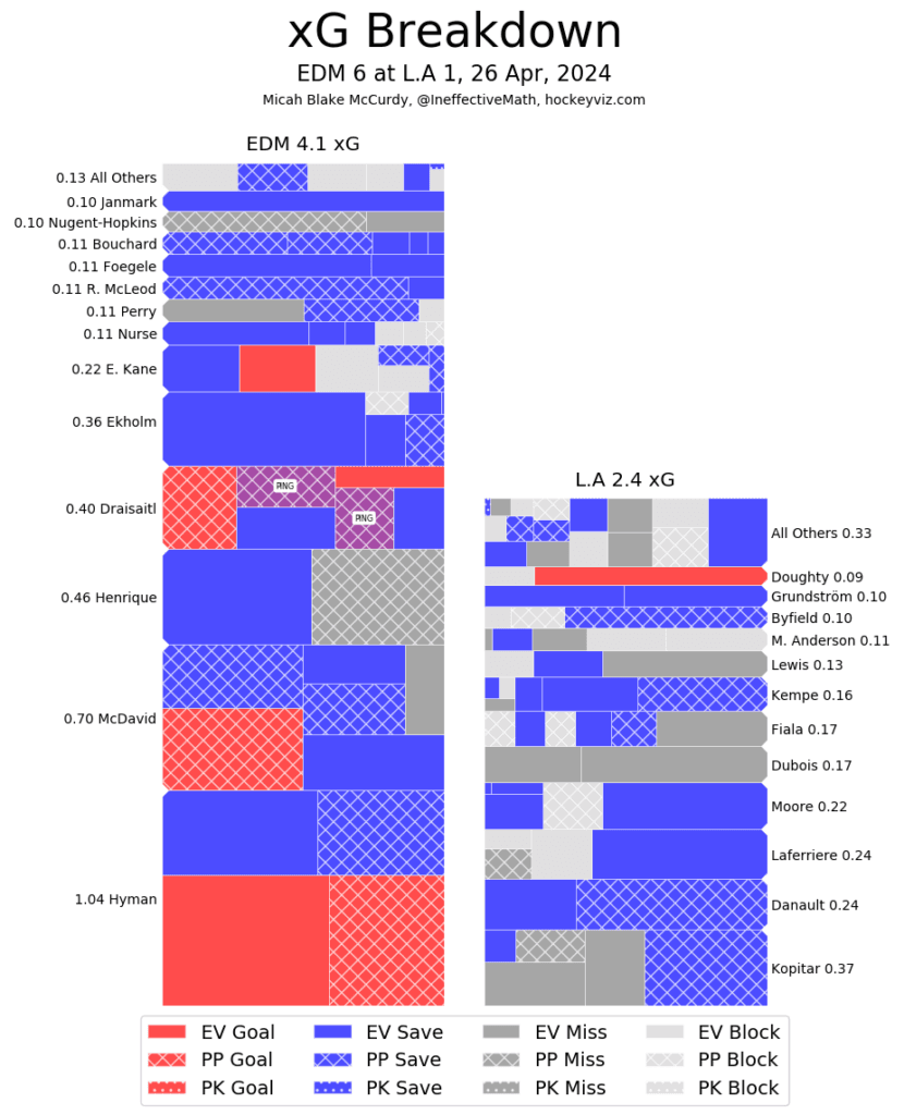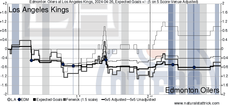 It’s a Team Game – That first goal is a massive factor in this series and that cannot be understated. Every goal the Oilers score to add to their lead further will loosen up the Kings’ defensive coverage as they have to try and forecheck for turnovers. By the time the Oilers can hit a three-goal lead, there is more space available than any one team should ever allow talented players like McDavid and Draisaitl to find. In this one, the Oilers held a clear advantage through 40 minutes in shot attempts and scoring chances with a massive lead in high-danger looks. The third period started with some King’s momentum, but the referees and penalties calmed things down, allowing Edmonton to easily cross the finish line with minimal resistance.