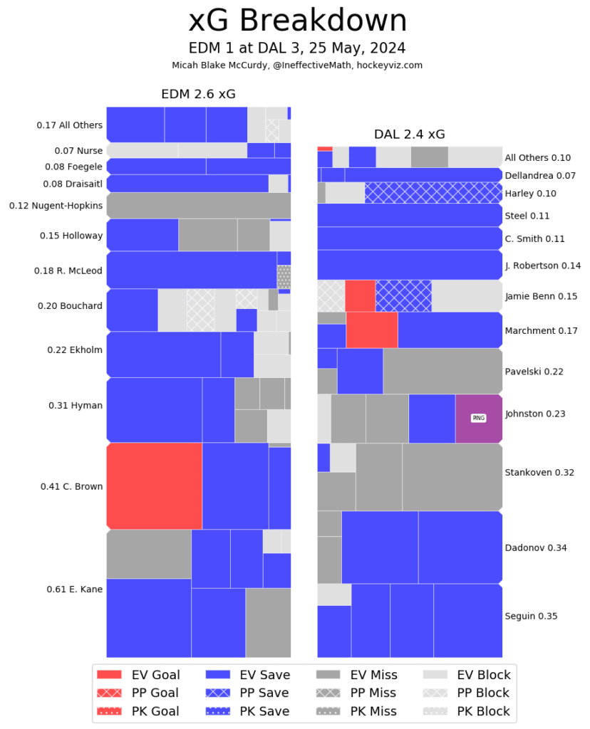 In The Crease – I’ve got nothing but compliments for Stuart Skinner, who made some pretty cool desperation saves all night. The Stars got some tremendous looks and he stopped all of those and then got beat by a greasy bounce – that’s the playoffs. With Stuart Skinner gave his team a chance to win with 2.41 expected goals against at 5v5, allowing two goals behind him. You probably want the Benn goal back, but the Brown response almost immediately allowed Skinner to reset and get back to playing good hockey. This one wasn’t on the goaltender.