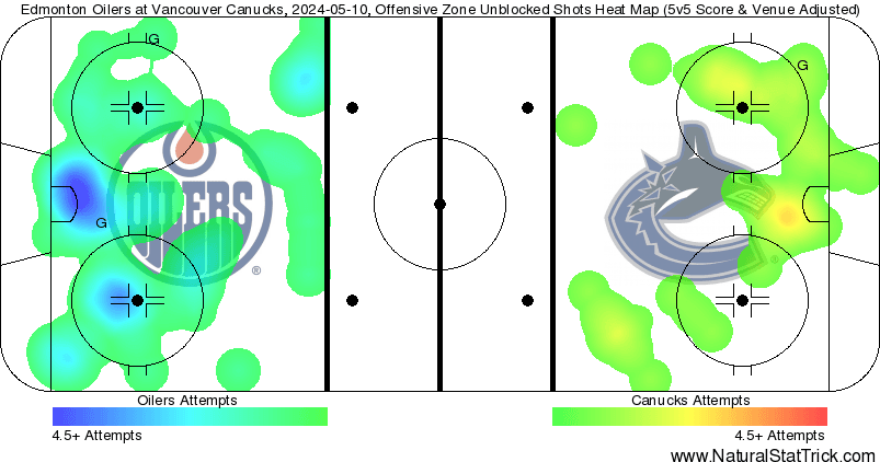 xGF% – Some people may be too shy to say it, but the real story of this game was the Oilers vs. their own goaltender. If Skinner hadn’t let in two bad goals, overtime wouldn’t be necessary, and everyone would have had more rest going home for game three. Darnell Nurse (27.91 percent) and Cody Ceci (24.83 percent) remain a liability for the Oilers. The Canucks have a relentless physical forecheck, and it’s been very effective pinning these two in their own zone. It should be worth exploring something new – Troy Stecher is available, but looking at long-time team members and telling someone they’ve got to sit is hard. Something has got to give, though, because Dallas or Colorado will expose this even more than the Canucks are already doing.