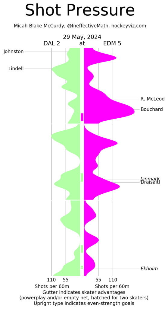 In The Crease – Goaltending is such a fine line. The Oilers were one goal away from another goalie crisis less than six minutes in and instead now would be nuts to shift off Skinner going into game 5. The vibe around the Oilers goaltending is changing per period in this series and it will continue to do that until the season is over. Skinner didn’t cave late, just early, and the Oilers rebounded fast enough they helped make his life easier by being able to play more structured in front of him. If they were trailing, they would have to be a lot more wild west run and gun but with the lead or tied you can limit the other team pretty effectively if you have the right personnel. Anyways, 1.60 expected goals against for Skinner with two getting behind him.