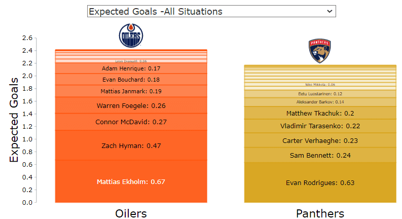 xGF% – Ekholm rocking a 92.17 percent xGF% crushes my soul. The man clearly left everything he had on the ice – had an entire playoff run worthy of being called a bonafide top pairing defenceman – only to experience a Cup Final loss for the second time in his career. The Oilers’ big five were clearly the best players in white – McDavid (87.94 percent), Bouchard (87.46 percent), Hyman (83.67 percent), Draisaitl (71.79 percent), and Ekholm were the spearheads of all the Oilers momentum. Knoblauch had a tremendous feel of his bench, all the players having subpar nights (the fourth line, really) had limited ice time. Besides when your backs against the wall I would also double shift McDavid. I’m sure McDavid would also double shift McDavid.
